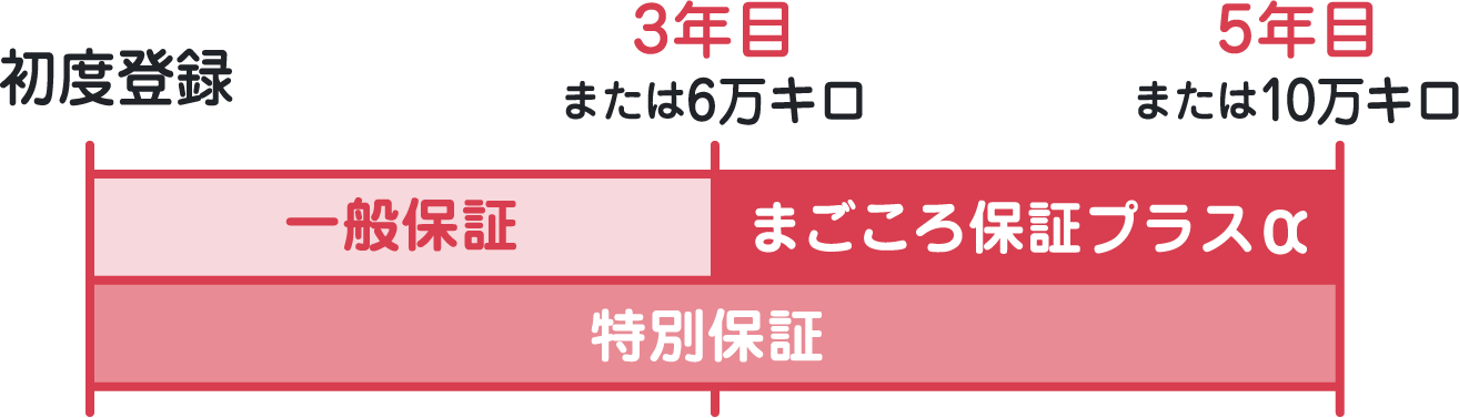初度登録年月から3年又は累計走行距離6万キロ経過後から5年10万キロまで、一般保証に準じて保証いたします。