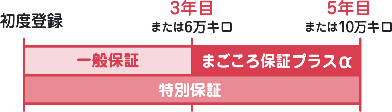 初度登録年月から3年又は累計走行距離6万キロ経過後から5年10万キロまで、一般保証に準じて保証いたします。